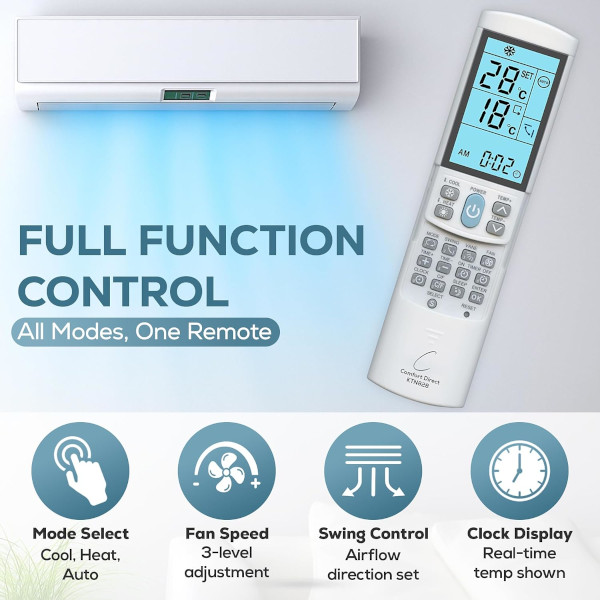 💡 Backlit LCD Display + Full Controls Easy-to-read illuminated screen showing clock + room temperature, with full control of mode, fan, swing, timer, and sleep functions.