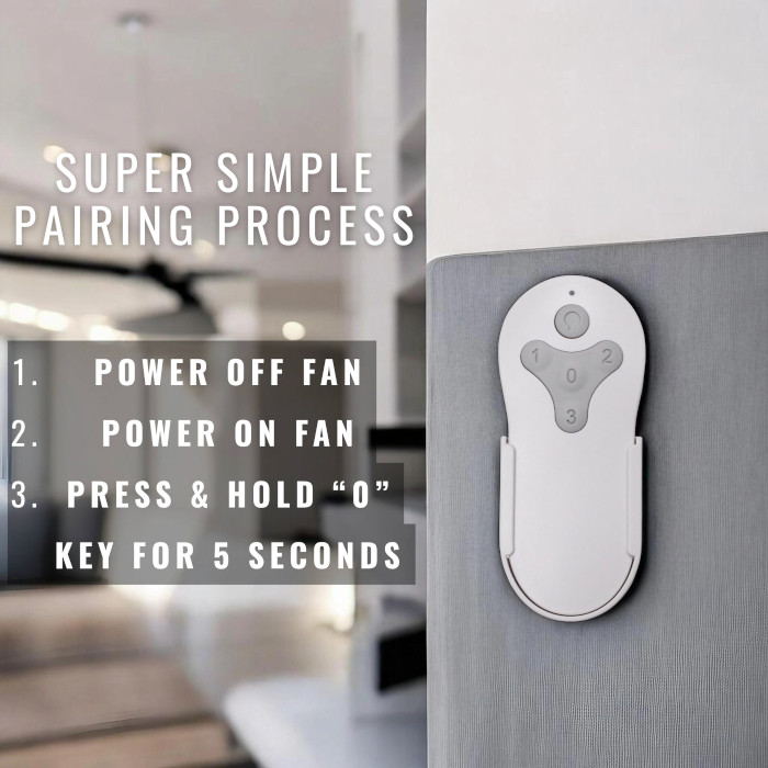 - 🔧 Easy Setup – Hassle-free pairing with your existing ceiling fan receiver: 1. Turn Power Off To Fan. 2. Turn Power Back On To Fan. 3. Press and hold the “0” key for 5 seconds.